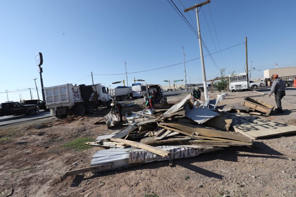 CD. JUAREZ, CHIH.- Como parte de los recorridos de inspección que realiza el Gobierno Municipal a través del programa de reordenamiento urbano, la Dirección de Limpia llevó a cabo este viernes el retiro de diversas estructuras instaladas indebidamente en el camellón central de la calle Mezquite Azul cruce con Acacias, del fraccionamiento Las Haciendas.
