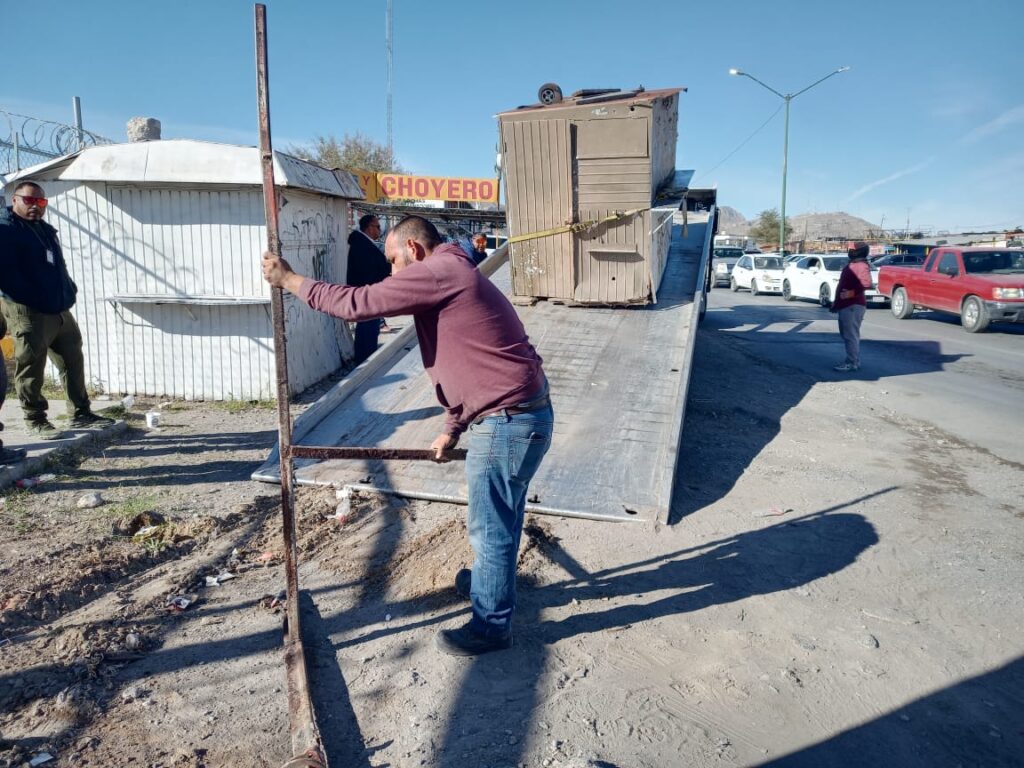 CD. JUAREZ, CHIH.- Como parte del Operativo de Reordenamiento Urbano, empleados de varias dependencias municipales retiraron este día dos puestos de lámina que obstruían la vía pública en el cruce de la Perimetral Carlos Amaya y calle Tzetzales.