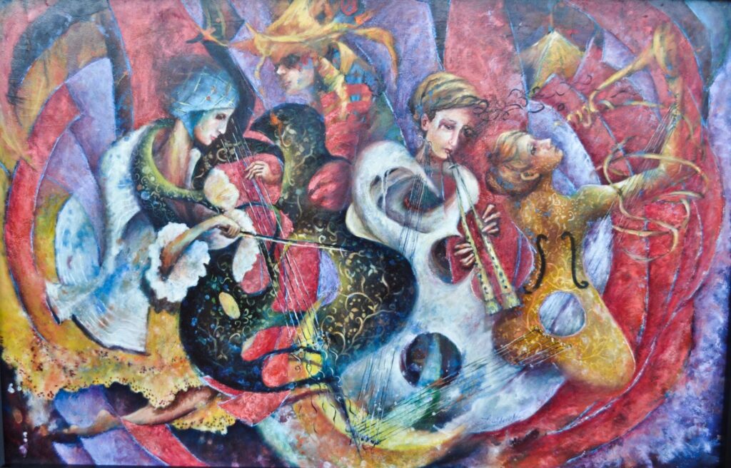 Una pintura que es un conjunto de músicos, tres mujeres, dos de ellas sus cuerpos son instrumentos musicales de cuerdas una especie de guitarra y violonchelo, la mujer guitarra toca la trompeta.