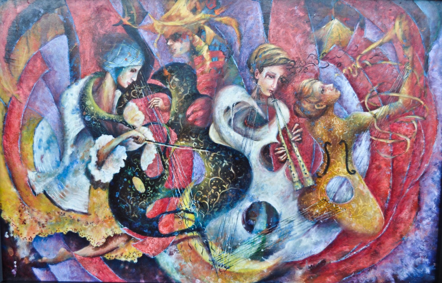 Una pintura que es un conjunto de músicos, tres mujeres, dos de ellas sus cuerpos son instrumentos musicales de cuerdas una especie de guitarra y violonchelo, la mujer guitarra toca la trompeta.