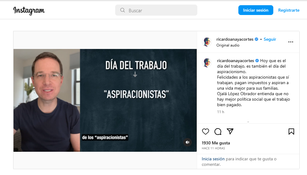 CIUDAD DE MEXICO.- En un video publicado el 1 de mayo en sus redes sociales, Ricardo Anaya elogió el esfuerzo de los trabajadores de México, a quienes llamó «aspiracionistas», como ha llamado AMLO a quienes tienen aspiraciones a una vida mejor y trabajan diariamente para sacar adelante a sus familias.