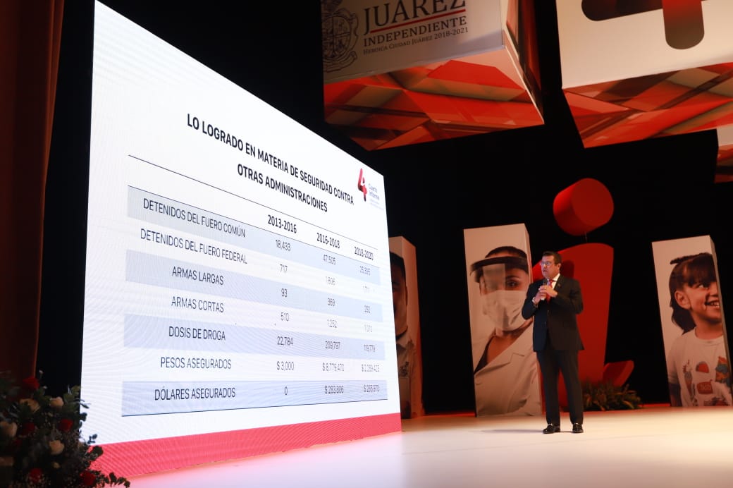 CD. JUAREZ, CHIH.- En un ejercicio inédito en materia de rendición de cuentas, aplicando las medidas de seguridad sanitaria ante la pandemia del Coronavirus COVID-19, el Presidente Municipal Armando Cabada Alvídrez rindió esta tarde su Cuarto Informe de Gobierno, segundo en la Administración 2018- 2021.