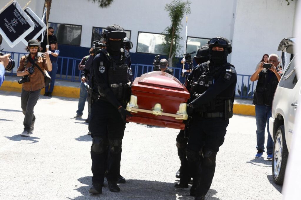 El Subinspector Víctor Sauceda Morales llamó al último pase de lista y el agrupamiento de fusileros del Grupo de Operaciones Especiales de la Secretaría de Seguridad Publica Municipal realizó el disparo de salvas, seguido del aullar de sirenas para su despedida.