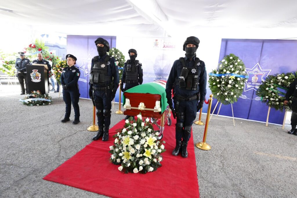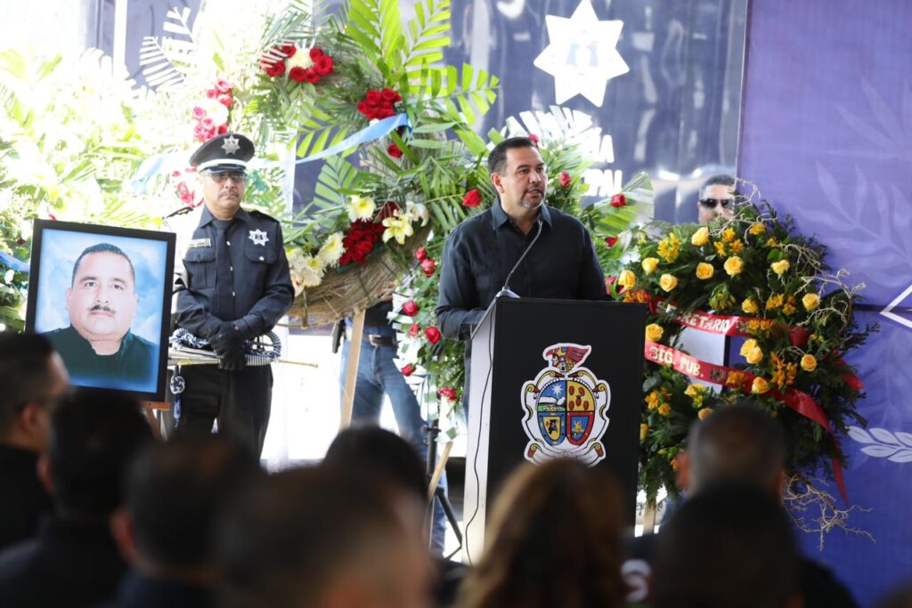 Como parte del homenaje, el oficial fue presentado ante sus compañeros, quienes le rindieron una Guardia de Honor junto al féretro, que fue encabezada por el Presidente Municipal y el Secretario de Seguridad Pública Municipal, César Omar Muñoz Morales, quienes hicieron entrega de la camisola y la Bandera Nacional a la familia.
