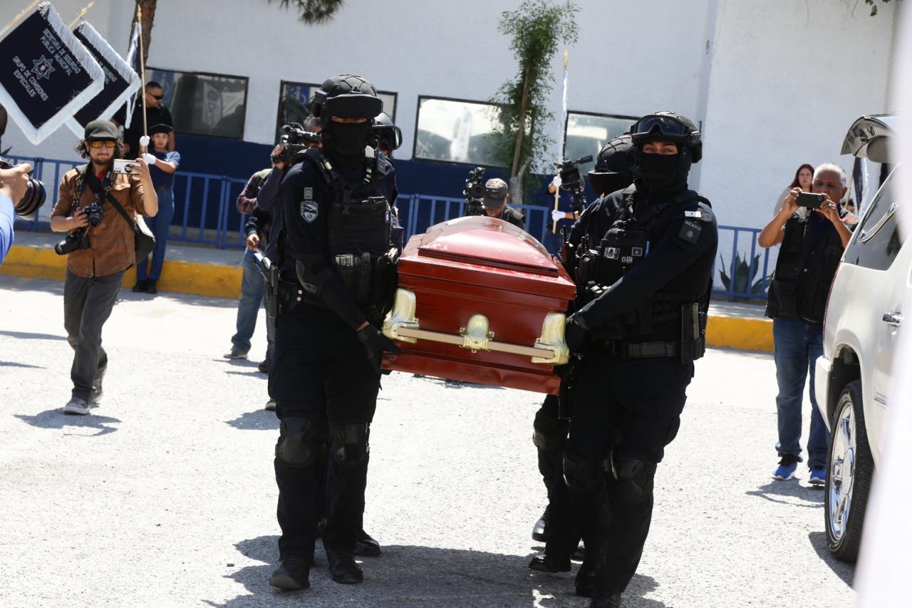 Como parte del homenaje, el oficial fue presentado ante sus compañeros, quienes le rindieron una Guardia de Honor junto al féretro, que fue encabezada por el Presidente Municipal y el Secretario de Seguridad Pública Municipal, César Omar Muñoz Morales, quienes hicieron entrega de la camisola y la Bandera Nacional a la familia.