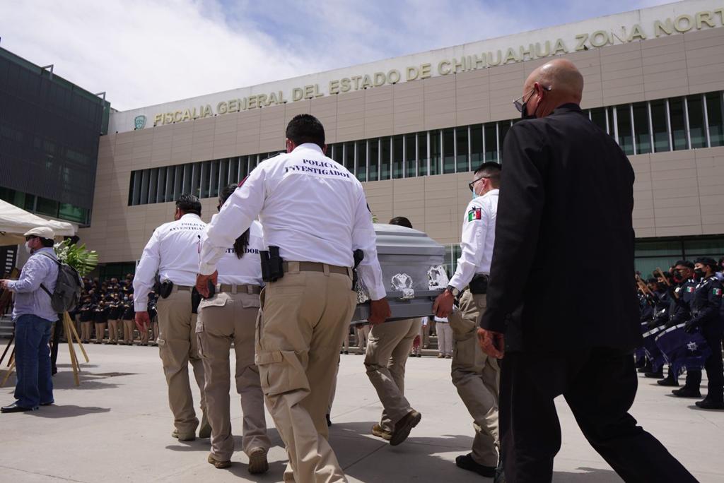 En Ciudad Juárez, la Fiscalía General del Estado de Chihuahua (FGE) Zona Norte, llevó a cabo a mediodía de este martes la ceremonia fúnebre del primer comandante de la Zona Noroeste, Alejandro Domínguez Cabriales; el oficial Gil Manuel Malo Solano y el comandante de Operaciones Tácticas, Ezequiel Emanuel Ortiz Fierro.