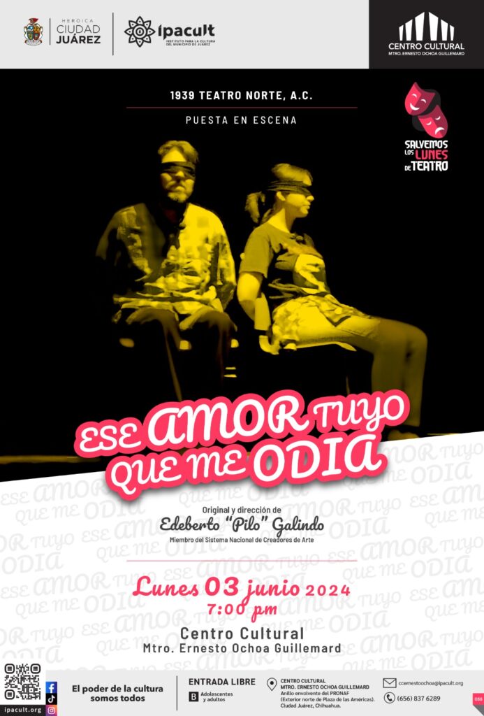CD. JUAREZ, CHIH.- Dentro del programa Salvemos los lunes de teatro, la comunidad podrá disfrutar el próximo 3 de junio la puesta en escena de “Ese amor tuyo que me odia”.