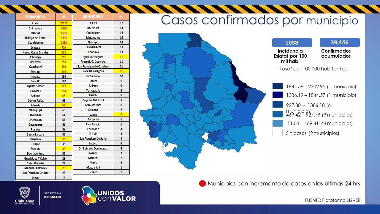 Casos por municipio: Ahumada 64, Aldama 85, Allende 66, Ascensión 62, Aquiles Serdán 147, Bachíniva 14, Batopilas 6, Bocoyna 254, Balleza 9, Buenaventura 31, Camargo 281, Carichí 8, Casas Grandes 24, Chihuahua 8,995, Chínipas 114, Coronado 4, Coyame del Sotol 8, Cuauhtémoc 1,258, Cusihuiriachi 13, Delicias 1,585, Dr. Belisario Domínguez 3, Galeana 7, Gómez Farías 68, Guachochi 230, Gran Morelos 8, Guadalupe 14, Guadalupe y Calvo 28, Guazapares 61, Guerrero 55, Hidalgo del Parral 1,445, Ignacio Zaragoza 11, Janos 18, Jiménez 180, Juárez 22,125, Julimes 9, López 7, Madera 34, Manuel Benavides 23, Matachí 2, Meoqui 216, Moris 2, Namiquipa 65, Nuevo Casas Grandes 612, Ocampo 14, Ojinaga 729, Praxedis G. Guerrero 11, Riva Palacio 6, Rosales 58, Rosario 3, San Francisco del Oro 23, Santa Bárbara 56, Satevó 4, Saucillo 162, Temósachic 9, Urique 35, Valle de Zaragoza 11, San Francisco de Conchos 11, Santa Isabel 10, La Cruz 17, San Francisco de Borja 4, Maguarichi 1, Nonoava 13, El Tule 4, Matamoros 14 y Uruachi 1.