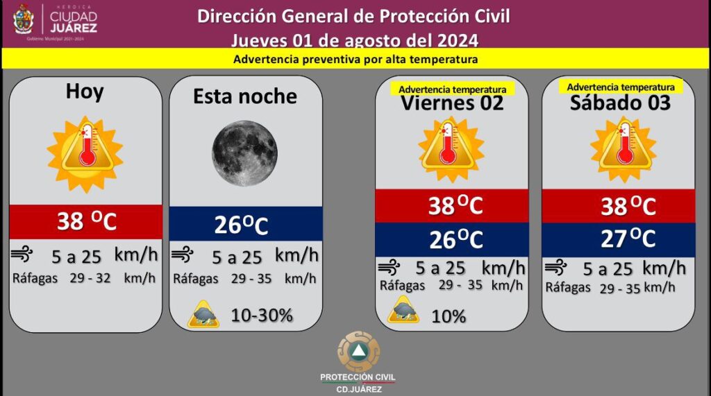 CD. JUAREZ, CHIH.- La Dirección de Protección Civil informa que para hoy jueves, se espera un día parcialmente nublado, con temperatura máxima de 38 grados Centígrados y mínima de 26 grados.