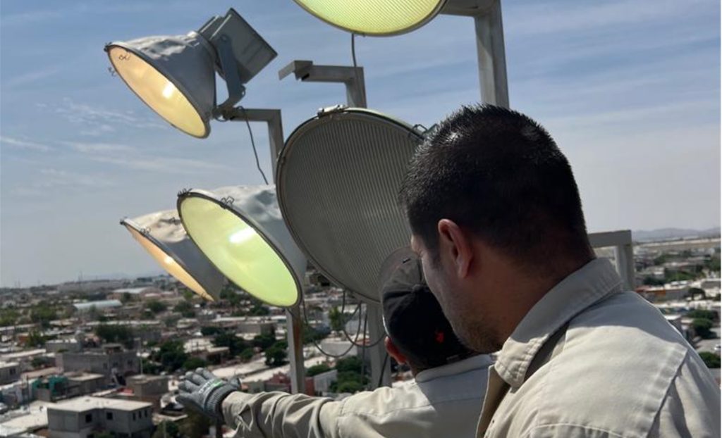 CD. JUAREZ, CHIH.-Cuadrillas del Instituto Municipal del Deporte y Cultura Física de Juárez y de la Dirección de Alumbrado Público, repusieron lámparas de mil watts en el parque Villas de Salvárcar.