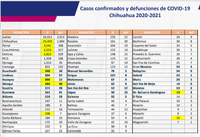 Los 19 nuevos casos de COVID-19 se concentran en los municipios de Chihuahua el cual suma 24 mil 459 casos, Parral 3 mil 541 casos, Cuauhtémoc 3 mil 253, Delicias 2 mil 822, Guachochi 748, Bocoyna 696, Meoqui 580, Guazapares 208, Belisario Domínguez 13 y Uruachi 10.