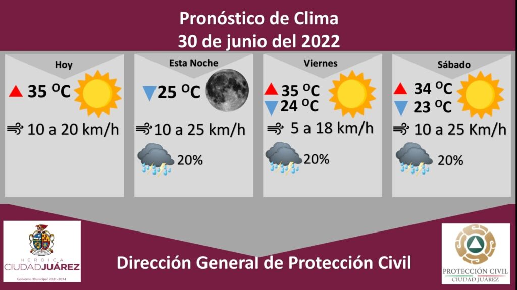 CD. JUAREZ, CHIH.- La Dirección General de Protección Civil, con base en informes del Servicio Meteorológico Nacional, pronostica un 20 por ciento de lluvia y tormentas eléctricas aisladas este jueves por la noche, dio a conocer Roberto Briones Mota, titular de la dependencia.