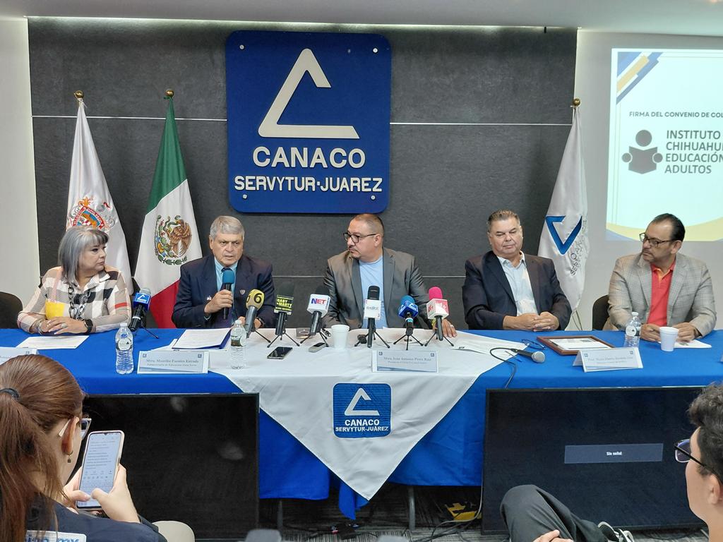 CD. JUAREZ, CHIH.- El Instituto Chihuahuense de Educación para los Adultos (Ichea), y la Cámara Nacional de Comercio, Servicios y Turismo de Ciudad Juárez (Canaco) firmaron un convenio de colaboración, para reducir el rezago educativo y atender a personas mayores de 15 años que no terminaron sus estudios de primaria y secundaria.