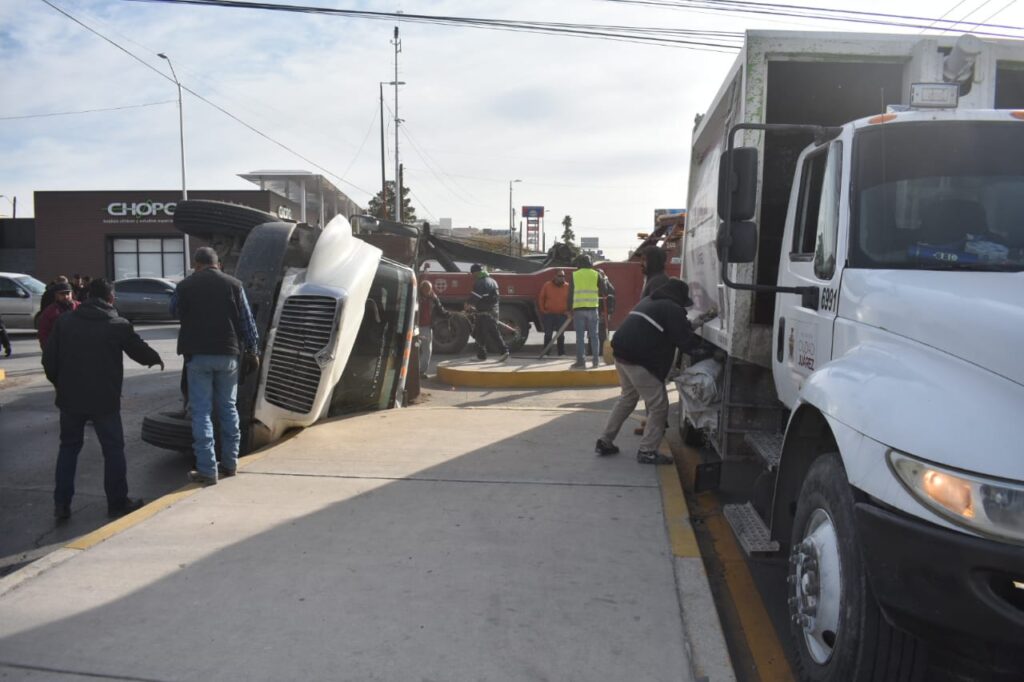 CD. JUAREZ, CHIH.– Tras la volcadura que se registró este lunes por la mañana en el cruce de las avenidas Adolfo López Mateos e Insurgentes, en donde se involucra una unidad de la Dirección de Limpia, se informó que no hubo heridos, ni daños a terceros.