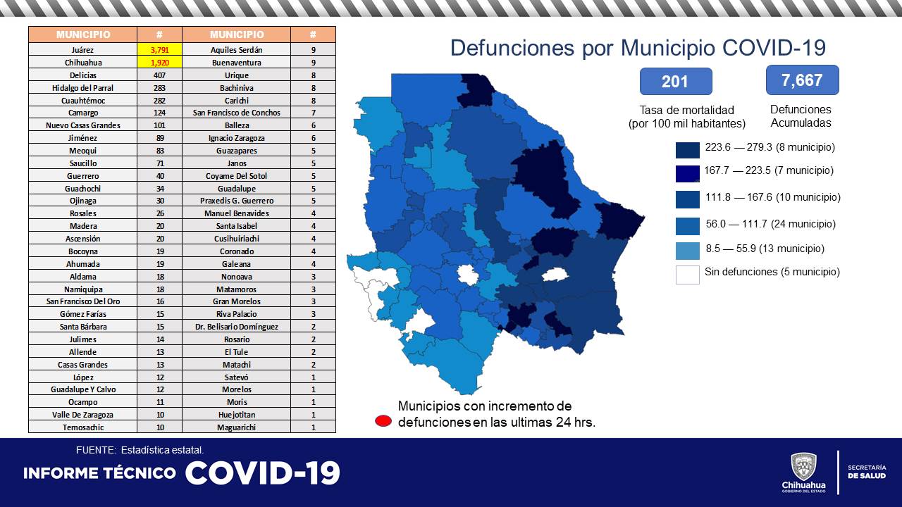 En casos acumulados por municipio la estadística es: 33,270 Juárez, 21,448 Chihuahua, 3,038 Hidalgo del Parral, 2,716 Cuauhtémoc, 2,525 Delicias, 1,270 Nuevo Casas Grandes, 1,251 Ojinaga, 674 Camargo, 622 Guachochi, 591 Jiménez, 539 Bocoyna, 404 Meoqui, 288 Saucillo, 278 Aldama, 253 Guerrero, 183 Aquiles Serdán, 178 Allende, 169 Guazapares, 158 Chínipas, 156 Namiquipa, 151 Gómez Farías, 135 Santa Bárbara, 131 Madera, 121 Ascensión, 112 Casas Grandes, 110 Rosales, 105 Buenaventura, 105 Guadalupe y Calvo, 96 Ahumada, 70 Julimes, 64 Urique, 60 Manuel Benavides, 48 San Francisco del Oro, 45 López, 42 Santa Isabel, 40 Balleza, 37 Janos, 37 Ocampo, 35 Nonoava, 34 Ignacio Zaragoza, 33 Valle de Zaragoza, 29 La Cruz, 29 Matamoros, 28 Bachíniva, 26 Temósachic, 24 Gran Morelos, 24 Coyame del Sotol, 23 Cusihuiriachi, 23 Guadalupe, 22 Praxedis G. Guerrero, 22 Galeana, 21 Satevó, 25 Coronado, 16 San Francisco de Conchos, 13 Carichí, 11 Batopilas, 11 San Francisco de Borja, 10 Dr. Belisario Domínguez, 10 Rosario, 9 El Tule, 9 Riva Palacio, 8 Moris, 8 Matachí, 7 Huejotitán, 7 Morelos, 5 Uruachi y 2 Maguarichi.