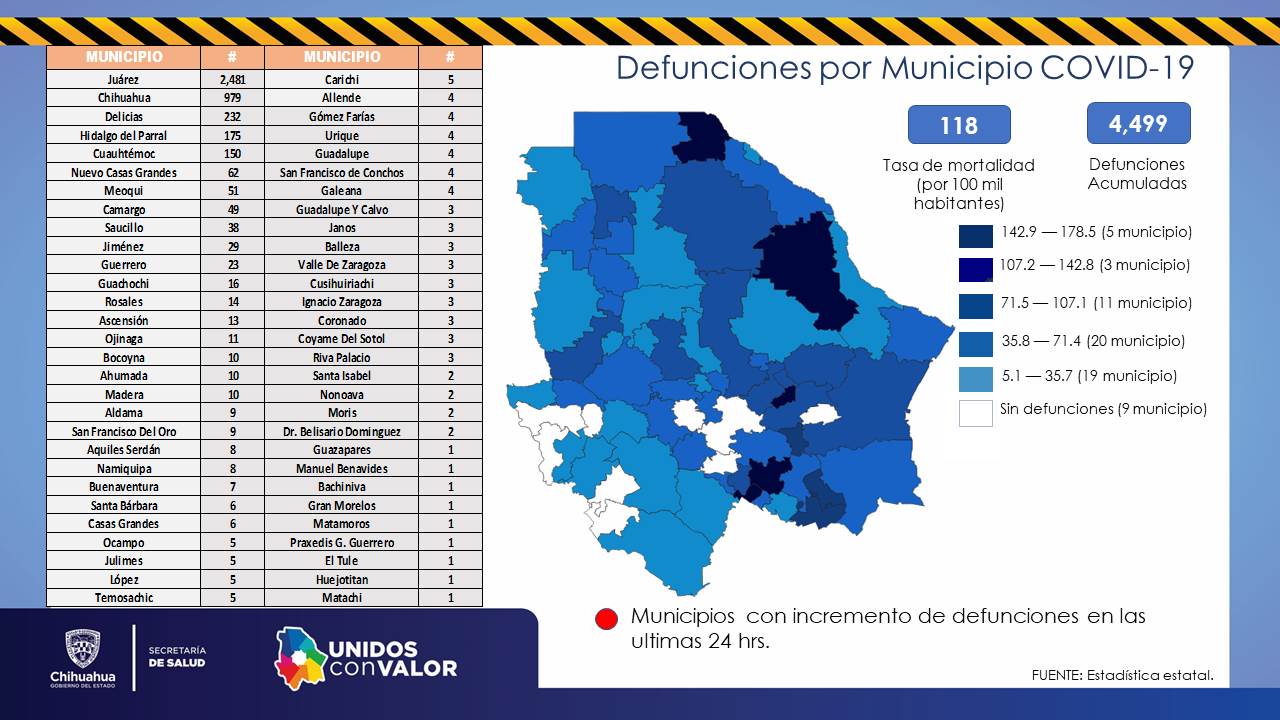 Decesos por municipio: 2,481 Juárez, 979 Chihuahua, 232 Delicias, 175 Parral, 150 Cuauhtémoc, 62 Nuevo Casas Grandes, 51 Meoqui, 49 Camargo, 38 Saucillo, 29 Jiménez, 23 Guerrero, 16 Guachochi, 13 Ascensión, 14 Rosales, 11 Ojinaga, 10 Madera, 10 Bocoyna, 10 Ahumada, 9 Aldama, 9 San Francisco del Oro, 8 Namiquipa, 8 Aquiles Serdán, 7 Buenaventura, 6 Casas Grandes, 6 Santa Bárbara, 5 Carichí, 5 Temósachi, 5 Ocampo, 5 Julimes, 5 López, 4 Galeana, 4 Urique, 4 Allende, 4 Gómez Farías, 4 Guadalupe D.B., 4 San Francisco de Conchos, 3 Balleza, 3 Riva Palacio, 3 Janos, 3 Coronado, 3 Valle de Zaragoza, 3 Ignacio Zaragoza, 3 Cusihuiriachi, 3 Coyame del Sotol, 3 Guadalupe y Calvo, 2 Dr. Belisario Domínguez, 2 Moris, 2 Nonoava, 2 Santa Isabel, 1 Matachí, 1 Bachíniva, 1 Guazapares, 1 Gran Morelos, 1 El Tule, 1 Huejotitán, 1 Matamoros, 1 Praxedis G. Guerrero y 1 Manuel Benavides.