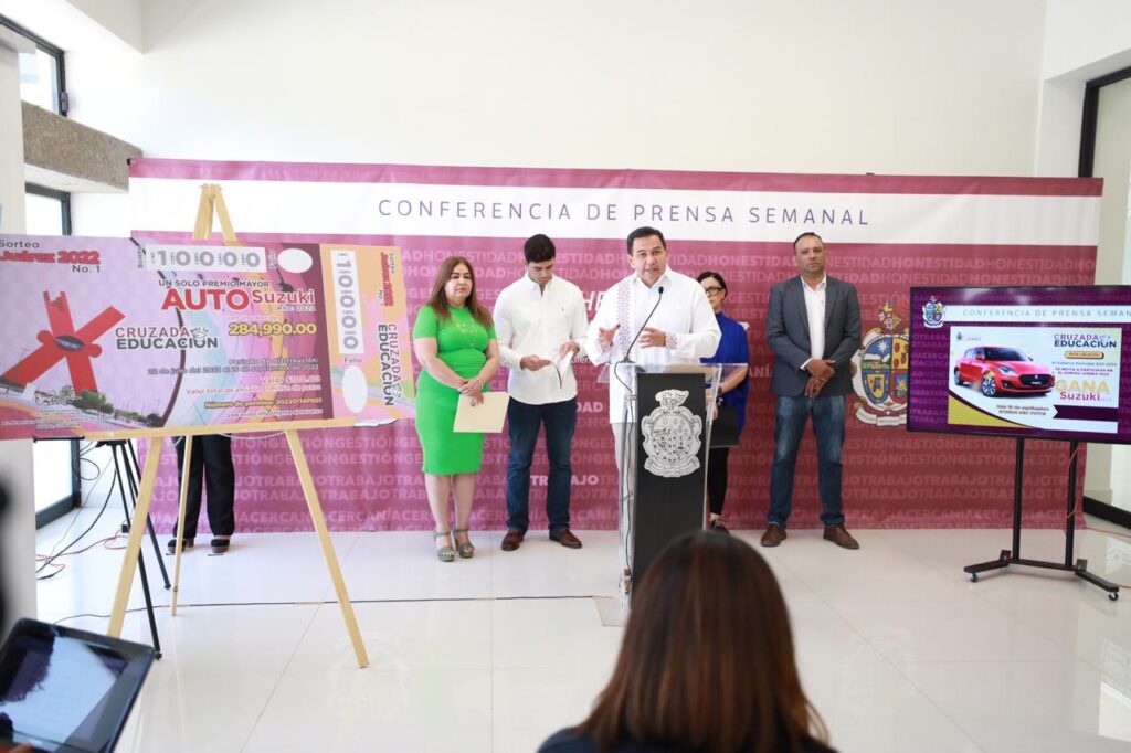En la conferencia de prensa que ofrece da semana, el Presidente Cruz Pérez Cuéllar indicó que este será el primer sorteo que organiza el Gobierno Municipal para recabar recursos que permitan realizar obras de mejoramiento en escuelas; será el próximo 16 de septiembre y de inicio son cuatro planteles en los que se podrán realizar obras de mejoramiento.