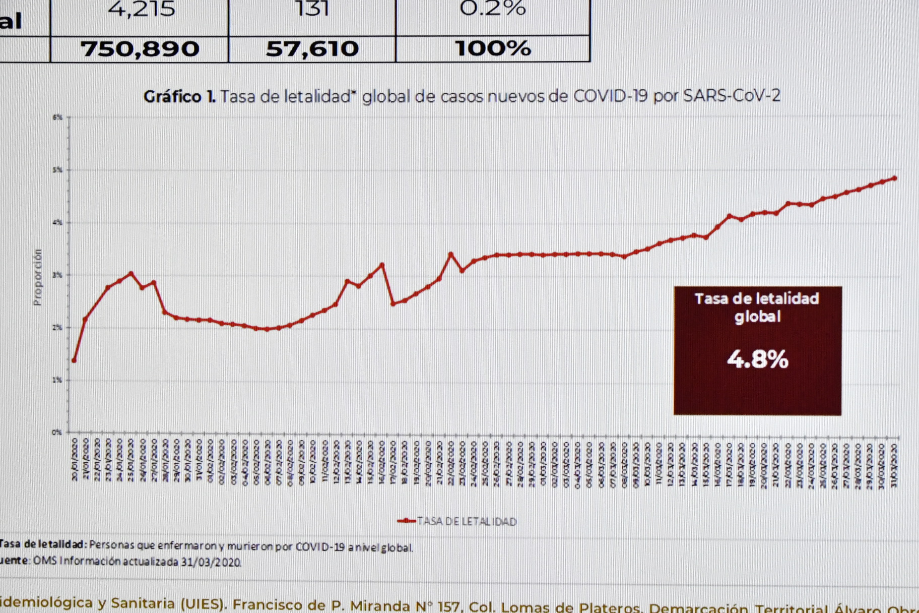 Dijo que a nivel mundial existen 750 mil 890 casos y la tasa de mortalidad es de 4.8 por ciento. Europa aglutina el 54 por ciento de los casos.