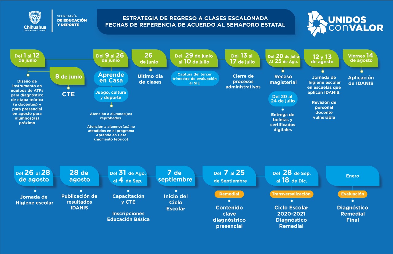 CIUDAD JUÁREZ, CHIH.- La Subsecretaría de Educación y Deporte de la Zona Norte dio a conocer las fechas más importantes para el cierre del ciclo escolar 2019-2020, además de la estrategia para el regreso a clases en el próximo ciclo lectivo 2020-2021 para planteles escolares del Nivel Básico.
