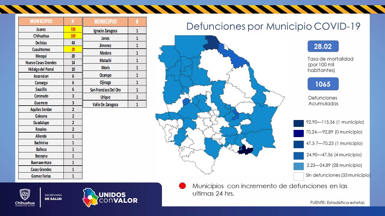 Decesos: 730 en Juárez, 169 en Chihuahua, 29 Cuauhtémoc, 2 Guadalupe D.B., 6 Ascensión, 6 Camargo, 2 Rosales, 1 Bachíniva, 20 Meoqui, 1 Buenaventura, 43 Delicias, 1 Ignacio Zaragoza, 1 San Francisco del Oro, 9 Parral, 1 Madera, 3 Coronado, 14 Nuevo Casas Grandes, 1 Ojinaga, 1 Valle de Zaragoza, 1 Bocoyna, 6 Saucillo, 1 Morís, 1 Gómez Farías, 1 Jiménez, 1 Urique, 1 Casas Grandes, 1 Allende, 1 Janos, 2 Galeana, 1 Ocampo, 2 Aquiles Serdán, 1 Balleza, 1 Matachí y 3 Guerrero.