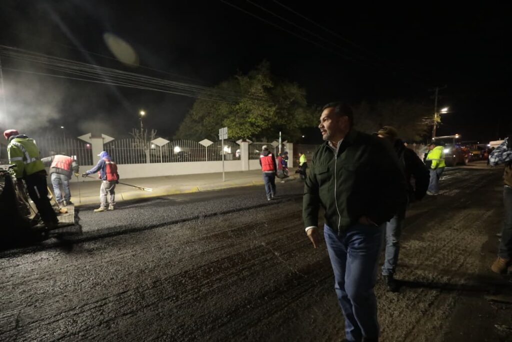 CD. JUAREZ, CHIH.- El Presidente Municipal, Cruz Pérez Cuéllar, supervisó la noche del viernes los trabajos de repavimentación que se llevan a cabo en las avenidas Tecnológico y Rafael Pérez Serna, como parte del programa de mantenimiento de vialidades.