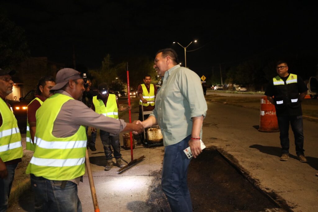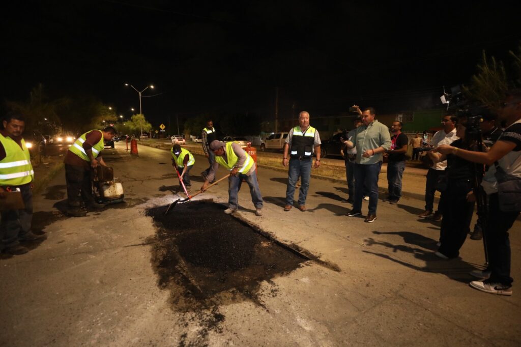 CD. JUAREZ, CHIH.-Como parte de las jornadas del programa de Brigadas especiales de bacheo, esta noche el Presidente Municipal, Cruz Pérez Cuéllar realizó una supervisión de actividad nocturna de bacheo en la avenida Valentín Fuentes, del tramo de avenida Ramón Rivera Lara a la avenida Ejército Nacional.