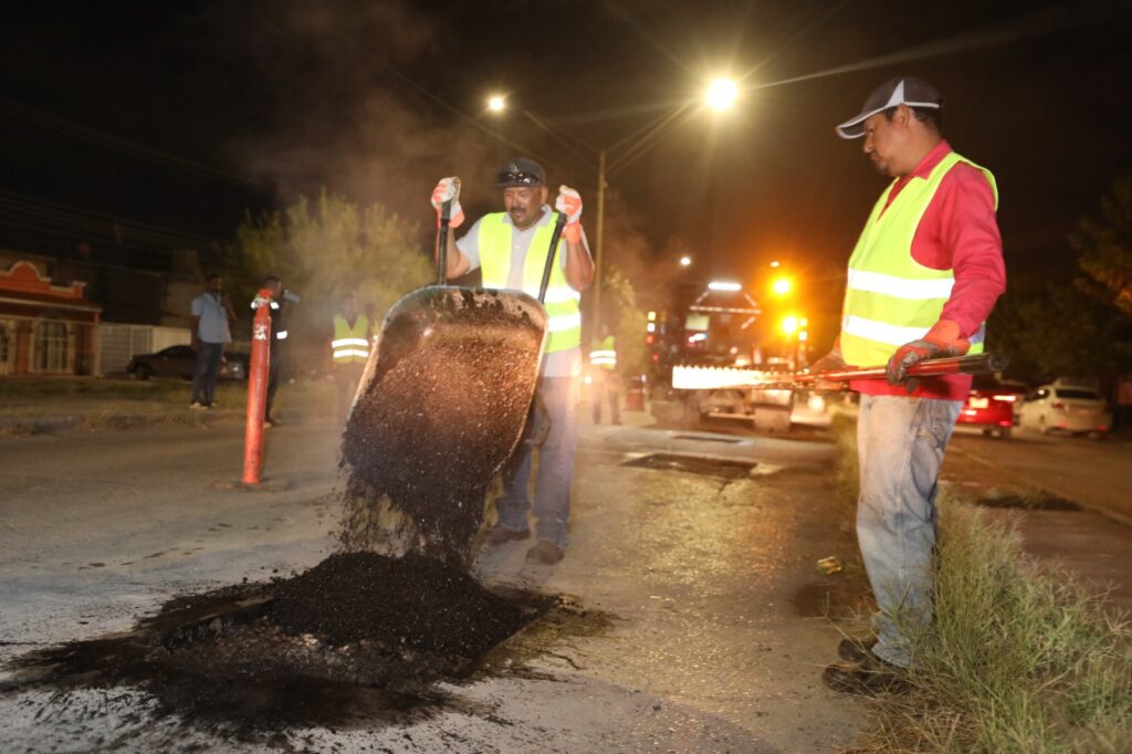 Las jornadas de bacheo se efectúan de manera diurna y nocturna, con el propósito de avanzar en el mantenimiento de vialidades que se vieron afectadas ante las fuertes lluvias.