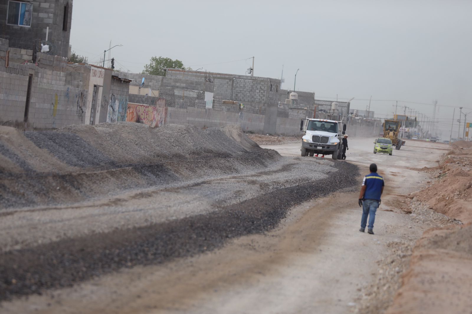 CD. JUAREZ, CHIH.- Esta mañana el Presidente Municipal, Cruz Pérez Cuéllar, estuvo en las inmediaciones de la avenida Lote Bravo para supervisar los trabajos que realiza la Dirección General de Obras Públicas para la pavimentación de dicha arteria en el suroriente de la ciudad.