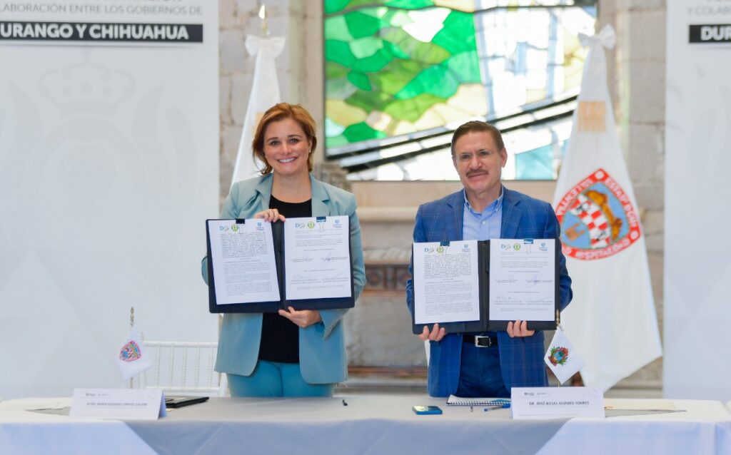 DURANGO.- La gobernadora Maru Campos Galván y su homólogo del Estado de Durango, José Rosas Aispuro, firmaron un Convenio Marco de Coordinación y Colaboración en materia de Seguridad Pública, para realizar acciones enfocadas en salvaguardar la vida, las libertades, la integridad y el patrimonio de la población de ambas entidades.