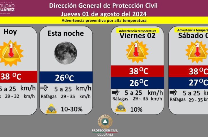 POR REDACCION JUEVES 1 AGOSTO 2024 CD. JUAREZ, CHIH.- La Dirección de Protección Civil informa que para hoy jueves, se...