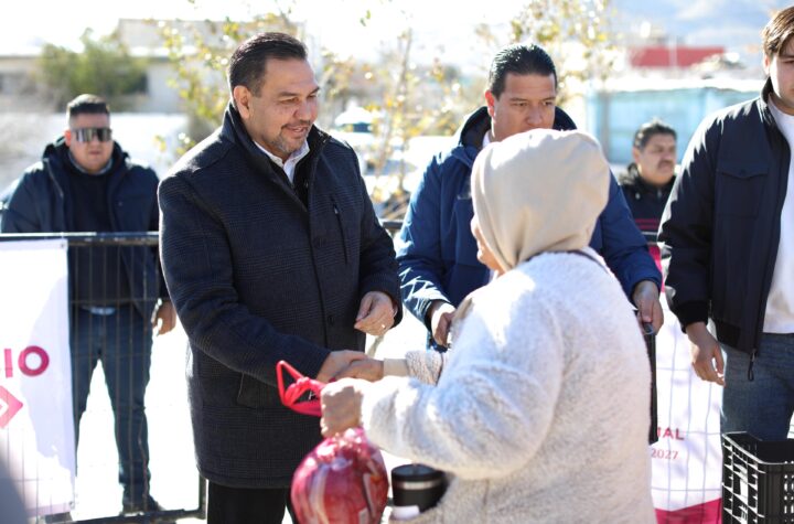 DOMINGO 11 ENERO 2026 POR REDACCION En ambas colonias entregó apoyos alimentarios consistentes en piernas de cerdo. CD. JUAREZ, CHIH.-...