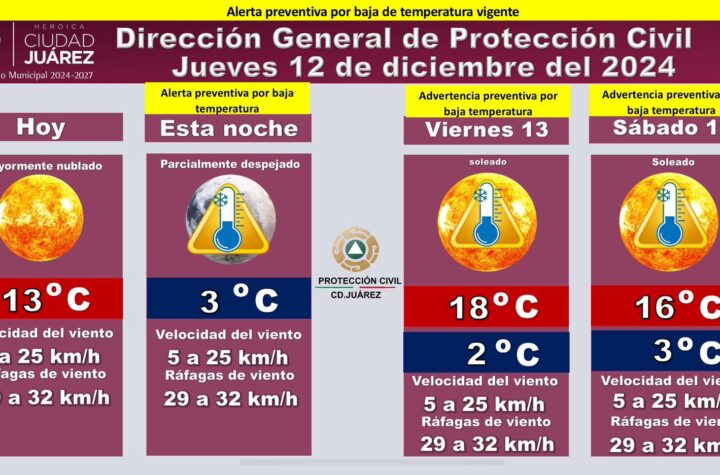 POR REDACCION VIERNES 13 DICIEMBRE 2024 CD. JUAREZ, CHIH.-La Dirección General de Protección Civil dio a conocer las condiciones climáticas...