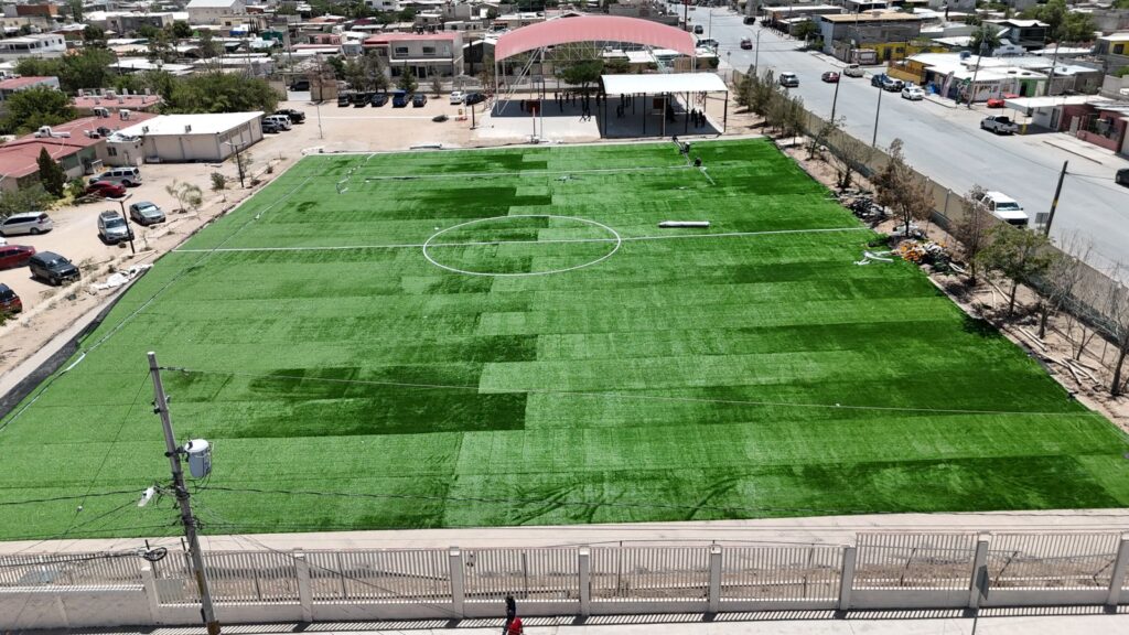 CD. JUAREZ, CHIH.- La Dirección General de Obras Públicas trabaja en la construcción de una cancha de fútbol en la Secundaria Federal #8, ubicada en la calle José Reyes Estrada y Manuel Quevedo Reyes, de la colonia Los Alcaldes, trabajos que se llevan a cabo como parte de los proyectos ganadores del Presupuesto Participativo.
