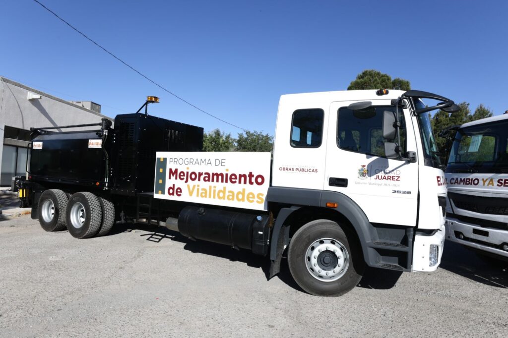 CD. JUAREZ, CHIH.- Este día el Presidente Municipal, Cruz Pérez Cuéllar, entregó dos camiones de bacheo a la Dirección General de Obras Públicas, lo que permitirá a la dependencia brindar un servicio permanente de bacheo en las principales avenidas de Ciudad Juárez.