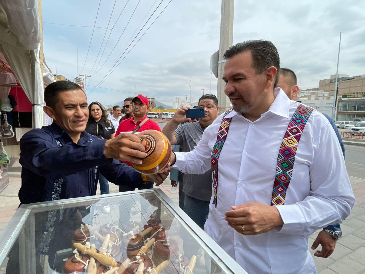 El Alcalde y su comitiva aprovecharon para visitar a los comerciantes del Festival Oaxaca en Ciudad Juárez, ubicados en la Plaza Misión de Guadalupe, en donde estarán desde hoy y hasta el 20 de junio ofreciendo artículos y productos comestibles tradicionales de esa entidad.
