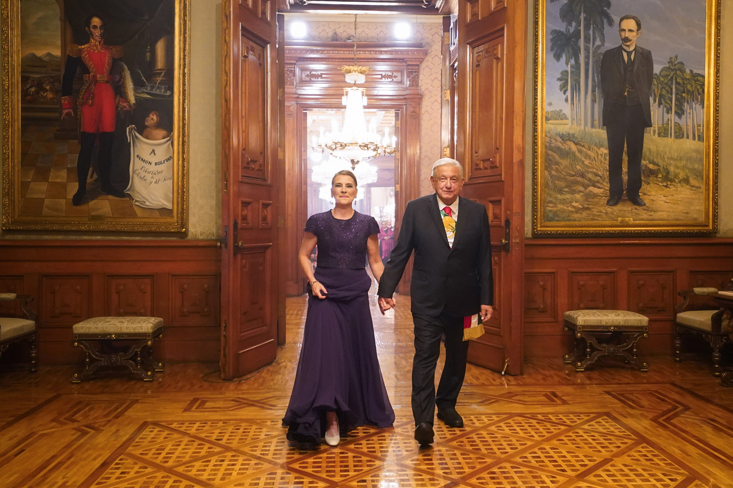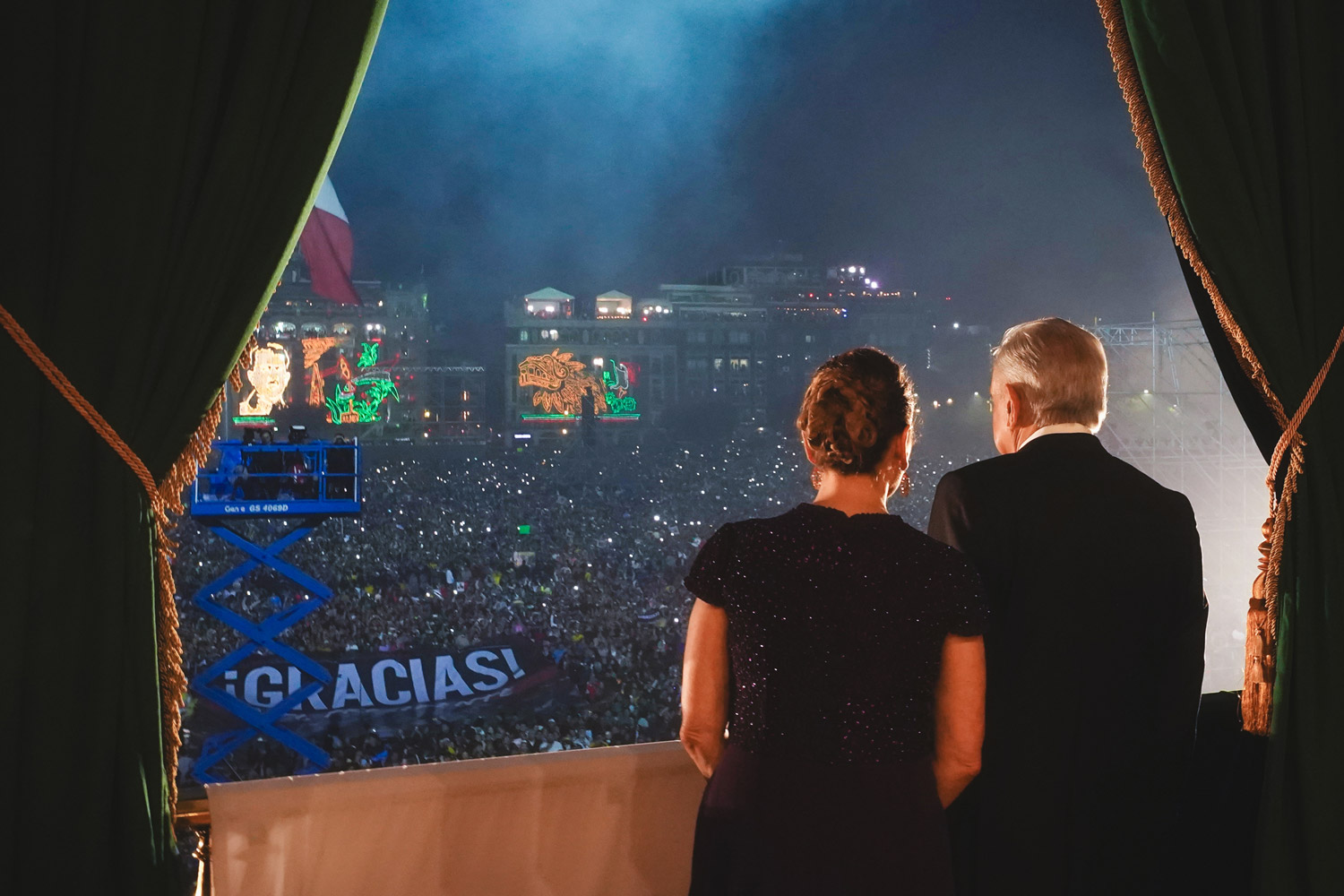 Luego del acto protocolario por la conmemoración del 214 Aniversario del Grito de Independencia, el jefe del Ejecutivo apreció junto a la doctora Beatriz Gutiérrez Müller luminarias con drones que formaron la palabra “¡Gracias!”.