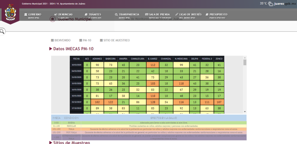 La página de Gobierno del Municipal, está presentando los datos de calidad del aire en la sección de Red de Monitoreo Ambiental de Juárez.